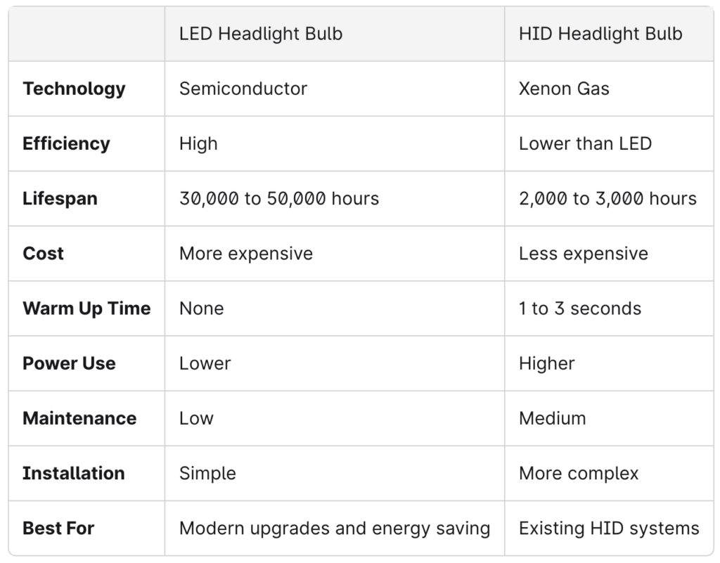 - Lifespan differences are substantial: modern LED headlight bulbs commonly outlast most HID bulbs by a wide margin.